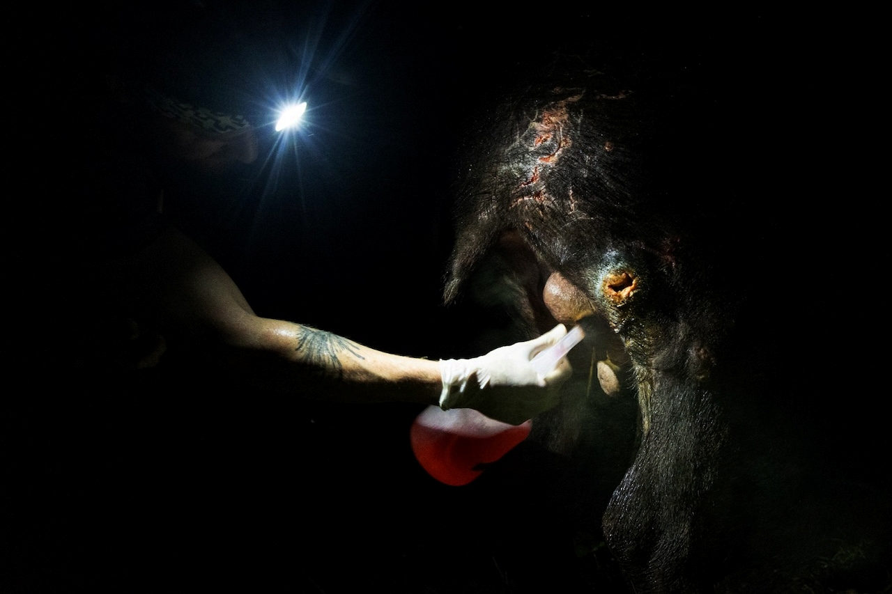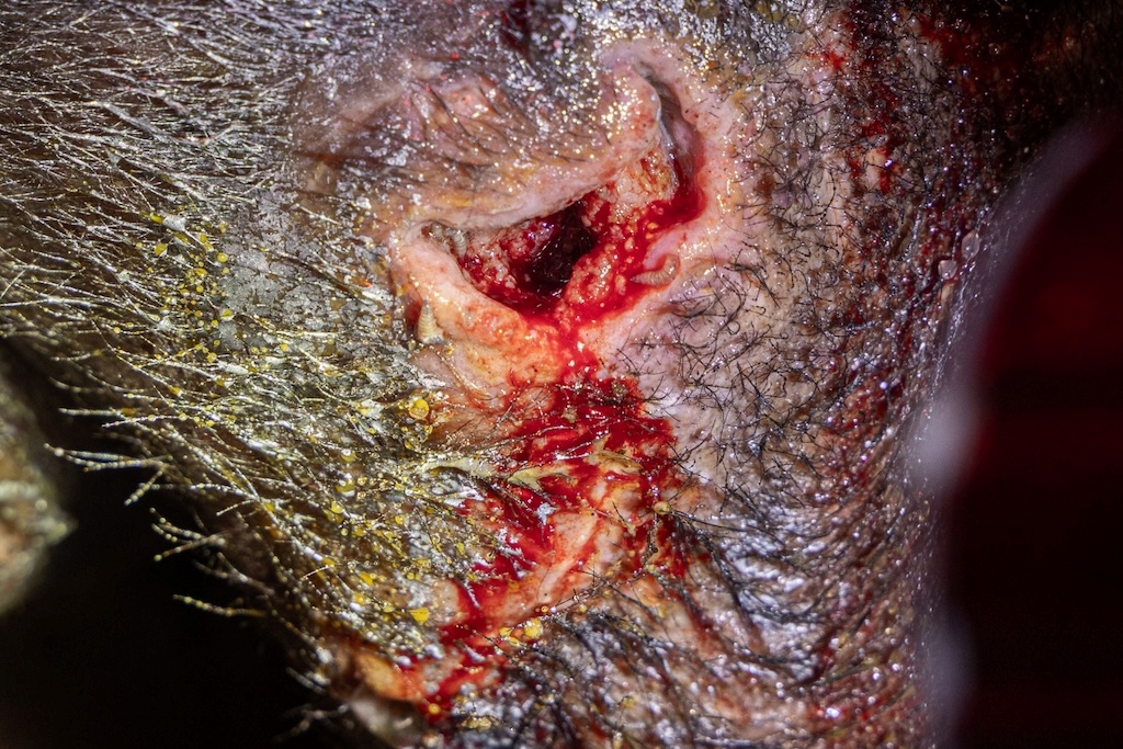Tapir infectado con gusano barrenador en Costa Rica. Fotos por Michiel Van Noppen