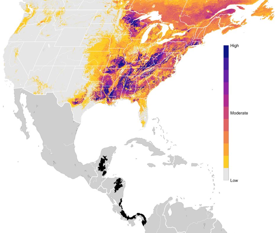 Usando millones de observaciones contribuidas por observadores de aves de todo el mundo a través de la plataforma eBird del Laboratorio de Cornell, los investigadores descubrieron que los Cinco Grandes Bosques albergan entre de una décima parte a casi la mitad de las poblaciones globales de 40 especies de aves migratorias. Estas incluyen especies que se reproducen en Canadá y Estados Unidos, pero que dependen de los bosques mesoamericanos para alimentarse, refugiarse y sobrevivir durante el invierno y en sus largos viajes hacia el norte y el sur.