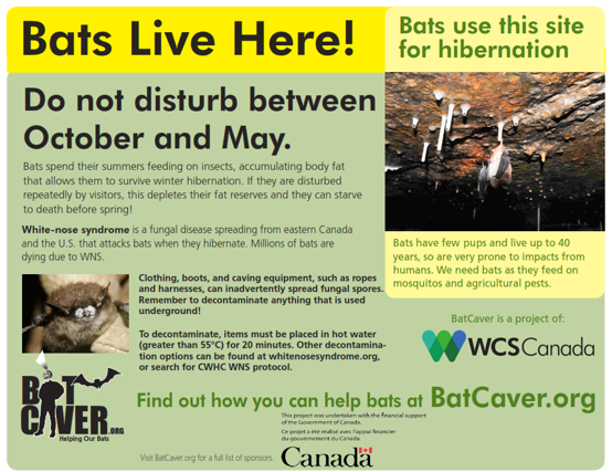 For those species who hibernate during Canada’s cold months, bats lower their body temperature during hibernation to reduce energy expenditure. To do this, they take refuge in roosts called hibernacula (abandoned mines, crevasses or caves with stable temperatures). During this critical period of the year, bats are very sensitive to changes in temperature, lighting and noises. Visiting caves during the hibernation period can be detrimental to bats as the presence of humans may trigger unnecessary arousals.
