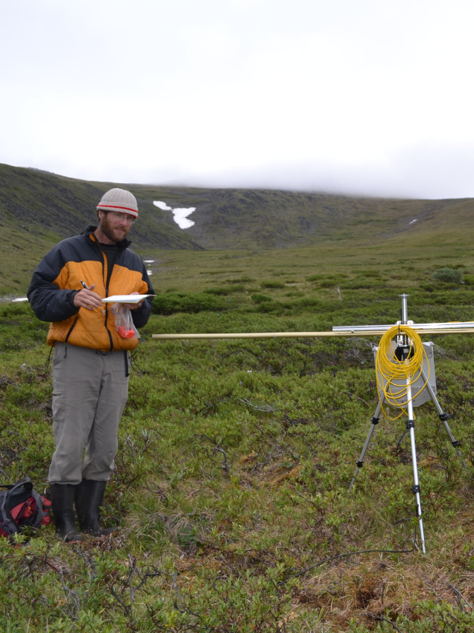 Scott Williamson, University of Alberta (PhD Candidate), is measuring how the reduction in snow cover and increase in shrub cover, as a result of climate change, affects tundra albedo (i.e. reflectance of sunlight on the earth’s surface) in the southwest Yukon. His project will identify which landscapes are rapidly changing and which are showing resilience which will, in turn, dictate the numbers and diversity of wildlife that the ecosystem can support.