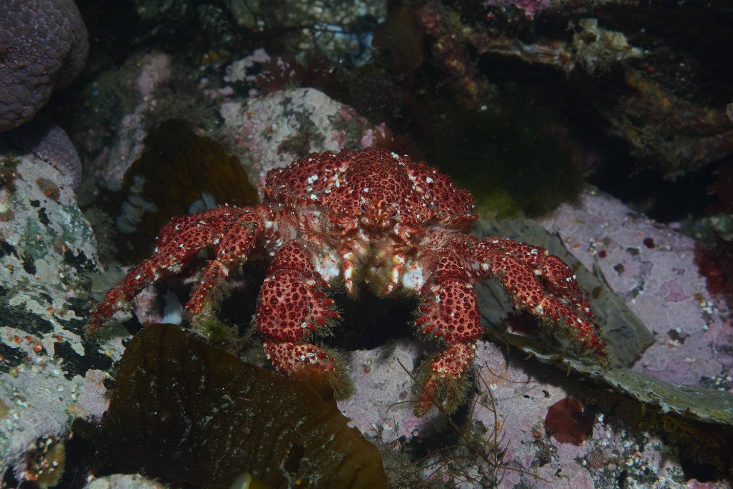 Izquierda, Phylum mollusca; clase bivalvia (ostión) con un chiton encima. (Mollusca; polyplacophora) en el islote Albatros. Centro. Phylum arthropoda; clase malacostraca; especie Lithodes santolla (centolla) @Mateo Cáceres. Derecha. Phylum: arthropoda; clase malacostraca; especie Paralomis granulosa (centollón) @Dirk Schories