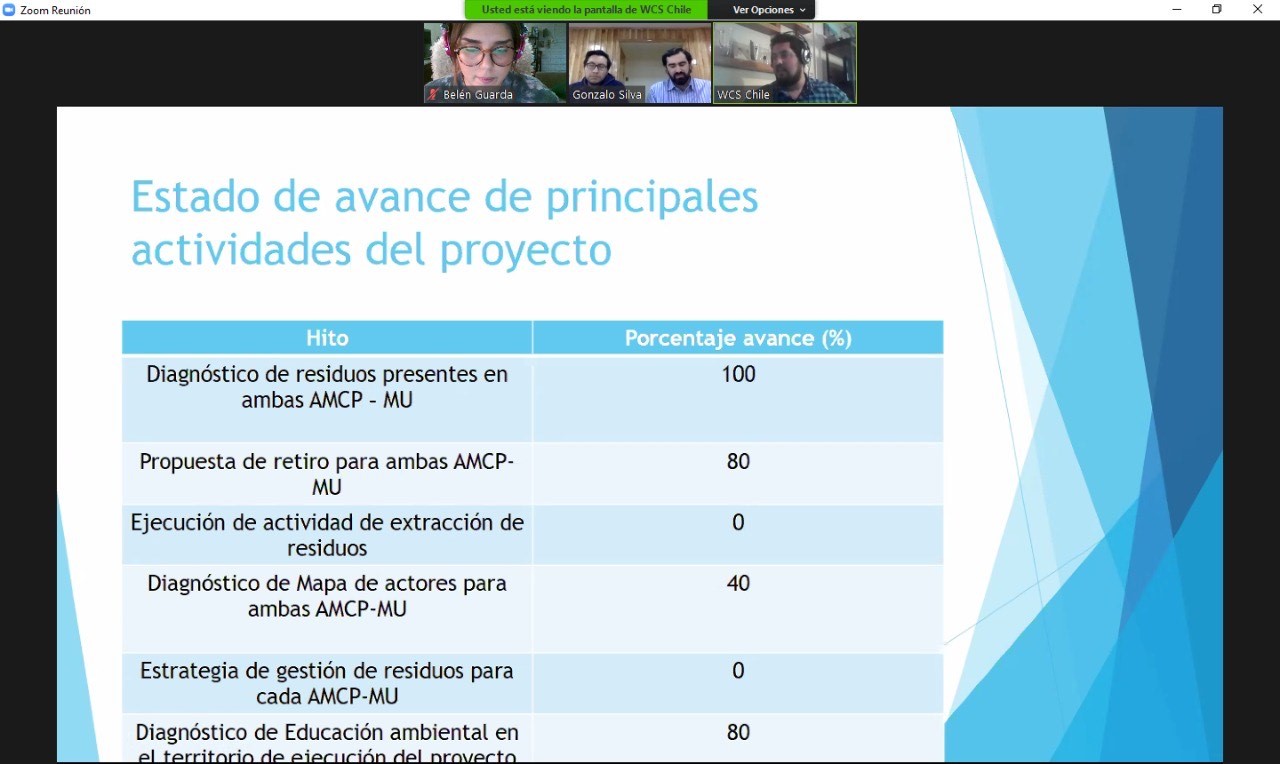 Aun cuando se ha debido suspender una serie de actividades y talleres en terreno, se implementó una metodología remota para continuar con el plan de trabajo por medio de videoconferencias y/o vía telefónica, lo que permitirá elaborar el “Diagnóstico: Mapa de actores para la gestión de residuos en las Área Marino Costero Protegida de Múltiples Usos Francisco Coloane y Seno Almirantazgo”. Estos talleres, además, permitirán ahondar en las competencias, influencias e intereses de los principales actores.