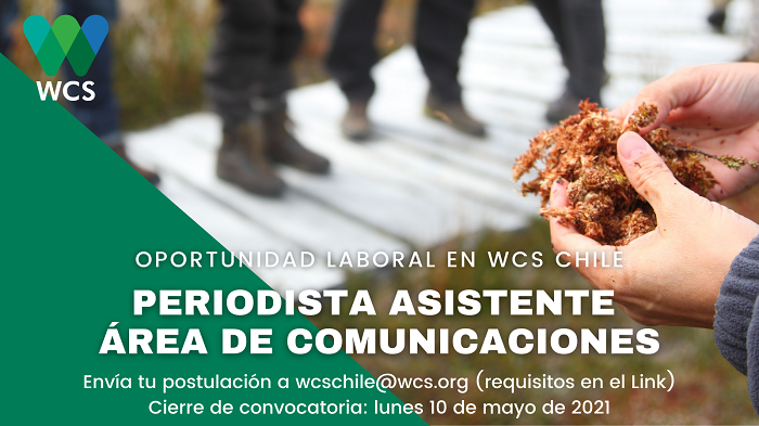 Postulación: enviar CV actualizado y carta de presentación e intención a wcschile@wcs.org indicando en el asunto: “Postulación Periodista asistente WCS Chile”. Es requisito excluyente indicar pretensiones de renta líquida en la carta. Se recibirán postulaciones hasta el lunes 10 de mayo del 2021.
