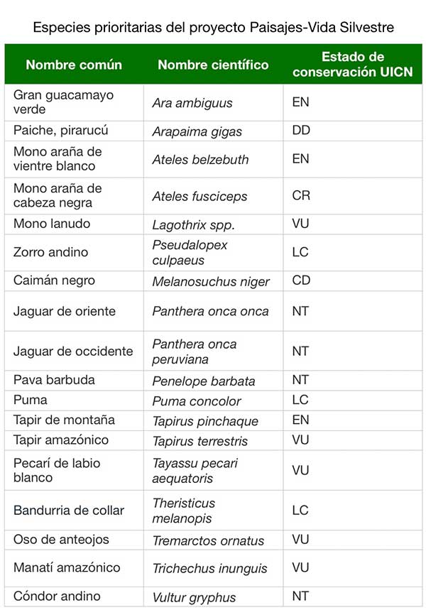 Adicionalmente, el PPVS trabajó en la conservación de 18 especies de vida silvestre amenazada globalmente (Tabla Especies prioritarias del proyecto Paisajes-Vida Silvestre), que fueron seleccionadas con base en el siguiente criterio: