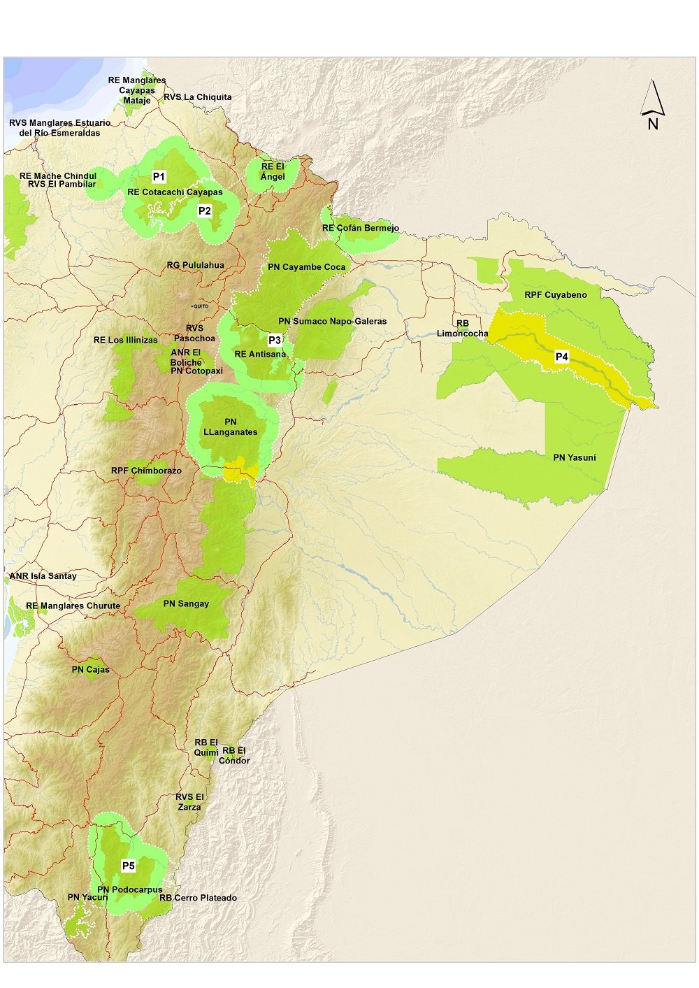 El Ecuador mantiene un sistema de áreas protegidas que incluye 54 reservas que contienen una amplia gama de especies silvestres importantes globalmente. Sin embargo, este sistema provee solamente una protección parcial a la vida silvestre, puesto que las áreas protegidas individuales son demasiado pequeñas para proteger las especies silvestres clave con requerimientos de grandes hábitats. Adicionalmente, las áreas protegidas pueden estar fragmentadas internamente y desconectadas de la totalidad del amplio paisaje, con implicaciones negativas para la viabilidad poblacional de las especies silvestres.