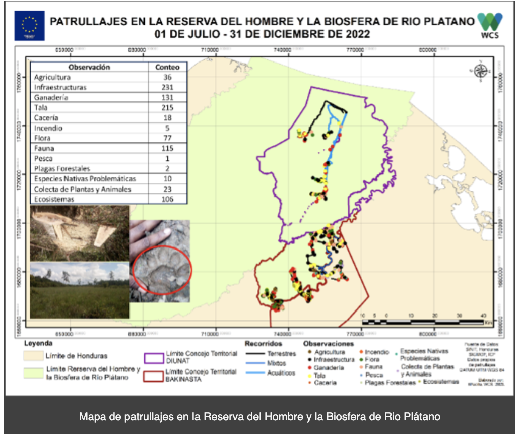 Ten indirect wildlife observations were also recorded (Tayassu pecari n=3, Tapirus bairdii n=2, Panthera onca n=4, Leopardus pardalis n=1). In addition, a Rama technician has been supported with the SMART application and has centralized the management and monitoring of the data. This person has helped in the coordination of all activities related to Indio Maíz.