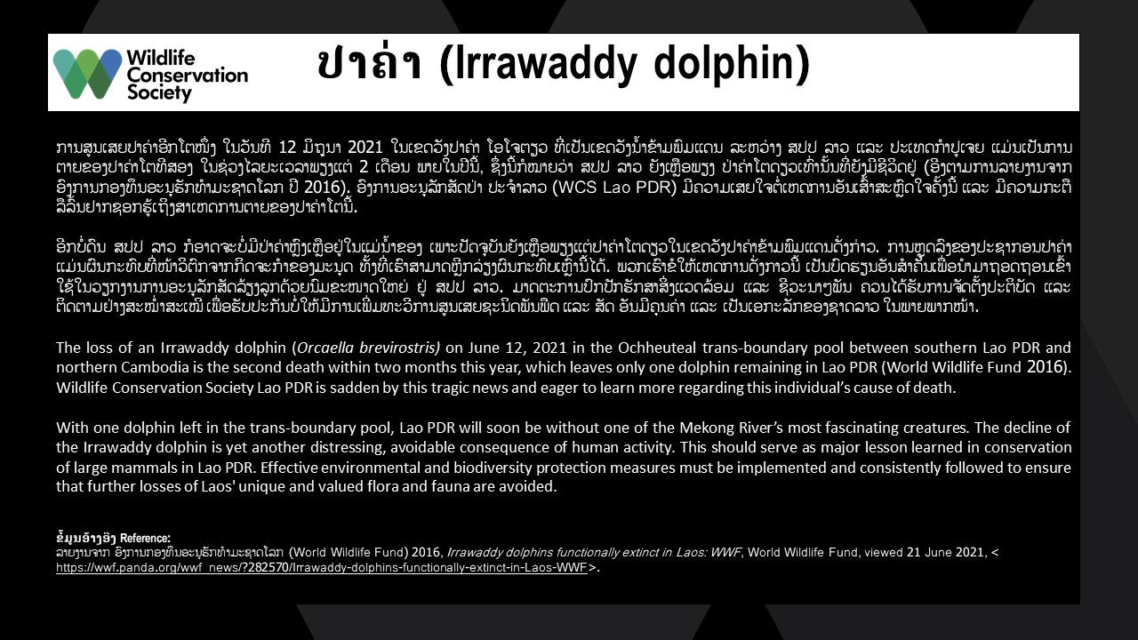 ລາຍງານຈາກ ອົງການກອງທຶນອະນຸຮັກທໍາມະຊາດໂລກ (World Wildlife Fund) 2016, Irrawaddy dolphins functionally extinct in Laos: WWF, World Wildlife Fund, viewed 21 June 2021, < https://wwf.panda.org/wwf_news/?282570/Irrawaddy-dolphins-functionally-extinct-in-Laos-WWF>.