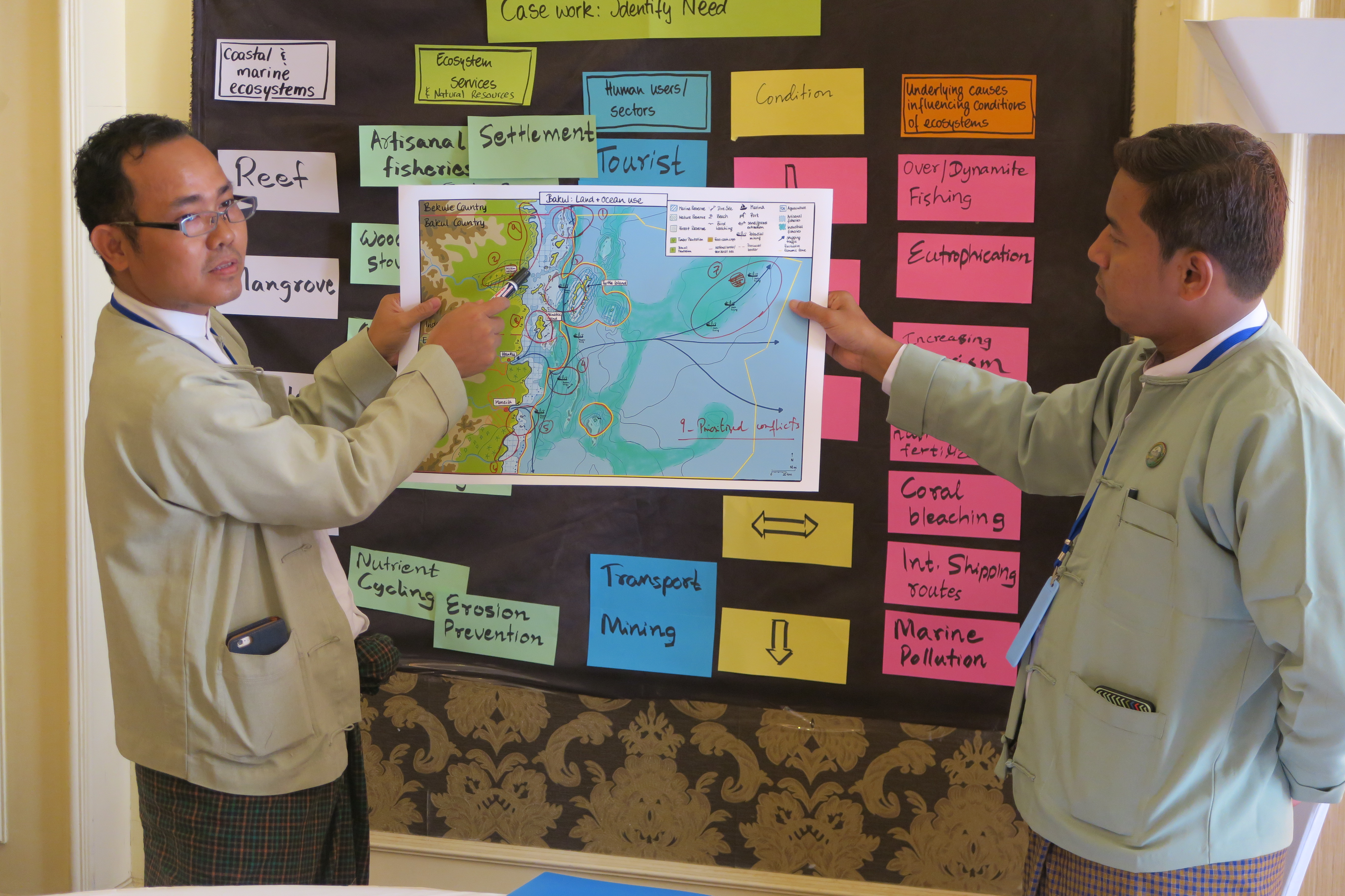 During November 27 – December 1, WCS initiated training on marine spatial planning to 20 representatives of Myanmar’s inter-agency National Coastal Resource Management Committee (NCRMC). In collaboration with trainers from the GIZ-supported Blue Solutions Initiative, the training workshop introduced participants to key blue planning concepts through case studies, presentations, discussions, and participatory exercises. Co-hosted by the Department of Fisheries and Forest Department, participants represented a wide range of government agencies involved in coastal and marine issues, including the Myanmar Oil and Gas Enterprise, Land Administration and Record Department, Marine Administration Department, and Ministries of: Hotels and Tourism; Social Welfare, Relief and Resettlement; Transportation and Communications; Electricity and Energy; and Planning and Finance. The event was opened by U Khin Maung Maw, Director General of the Department of Fisheries (reference news media).