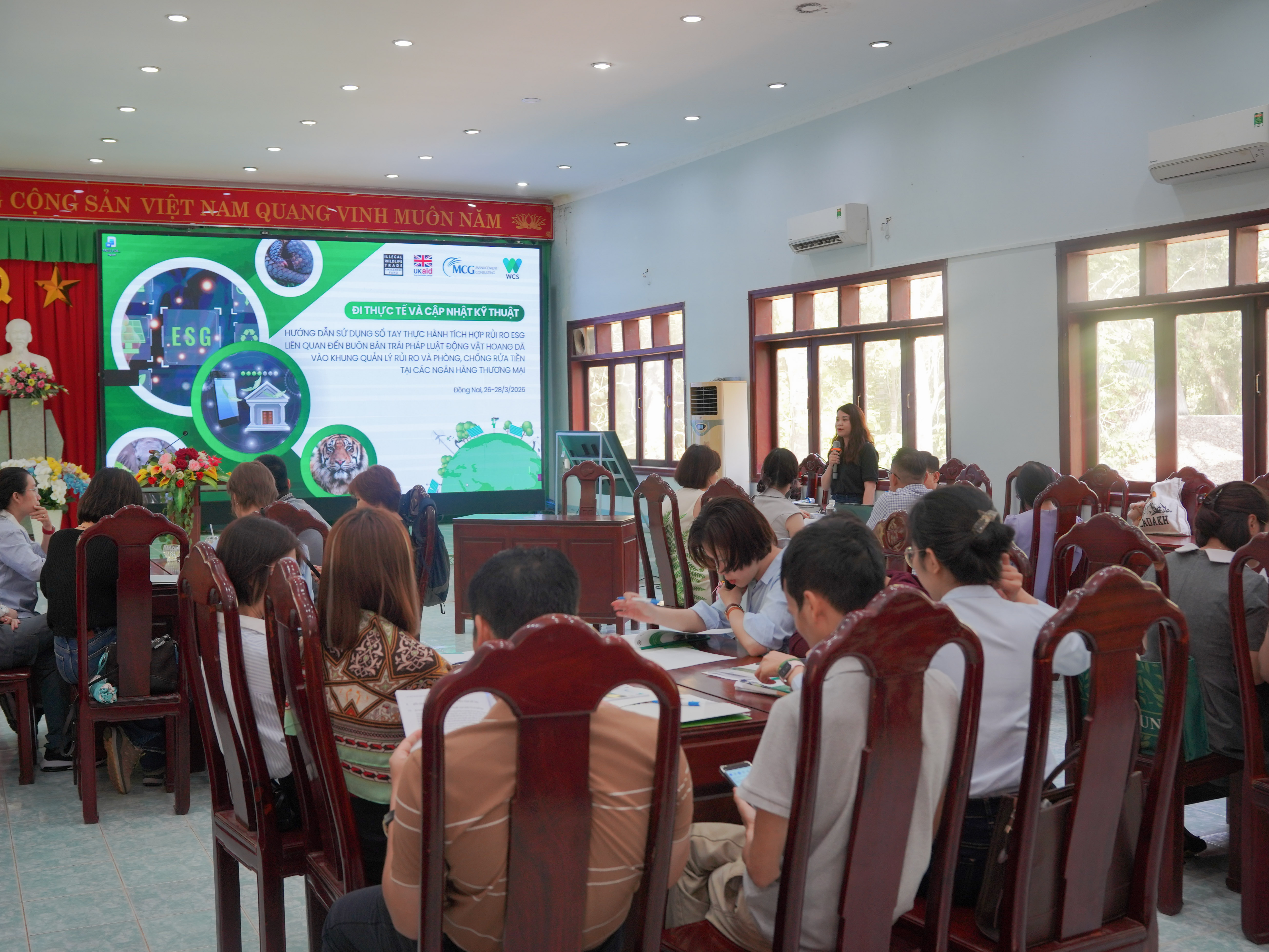 To highlight the link between the financial sector and wildlife conservation, experts from WCS Viet Nam provided updates on the situation of illegal wildlife trade in Viet Nam, emphasizing that it constitutes a predicate offense to money laundering as regulated in the Penal Code 2015 (amended and supplemented in 2017, 2025). Experts from MCG introduced the “Handbook on Integrating ESG Risks Related to Illegal Wildlife Trade into Risk Management and Anti-Money Laundering Frameworks in Commercial Banks” through case studies and group discussions. Through these activities, participants were guided to identify ESG risks, recognize red flags of potential money laundering linked to illegal wildlife trade, and apply these insights to their organizations’ risk governance frameworks as well as Environmental and Social Management Systems (ESMS).